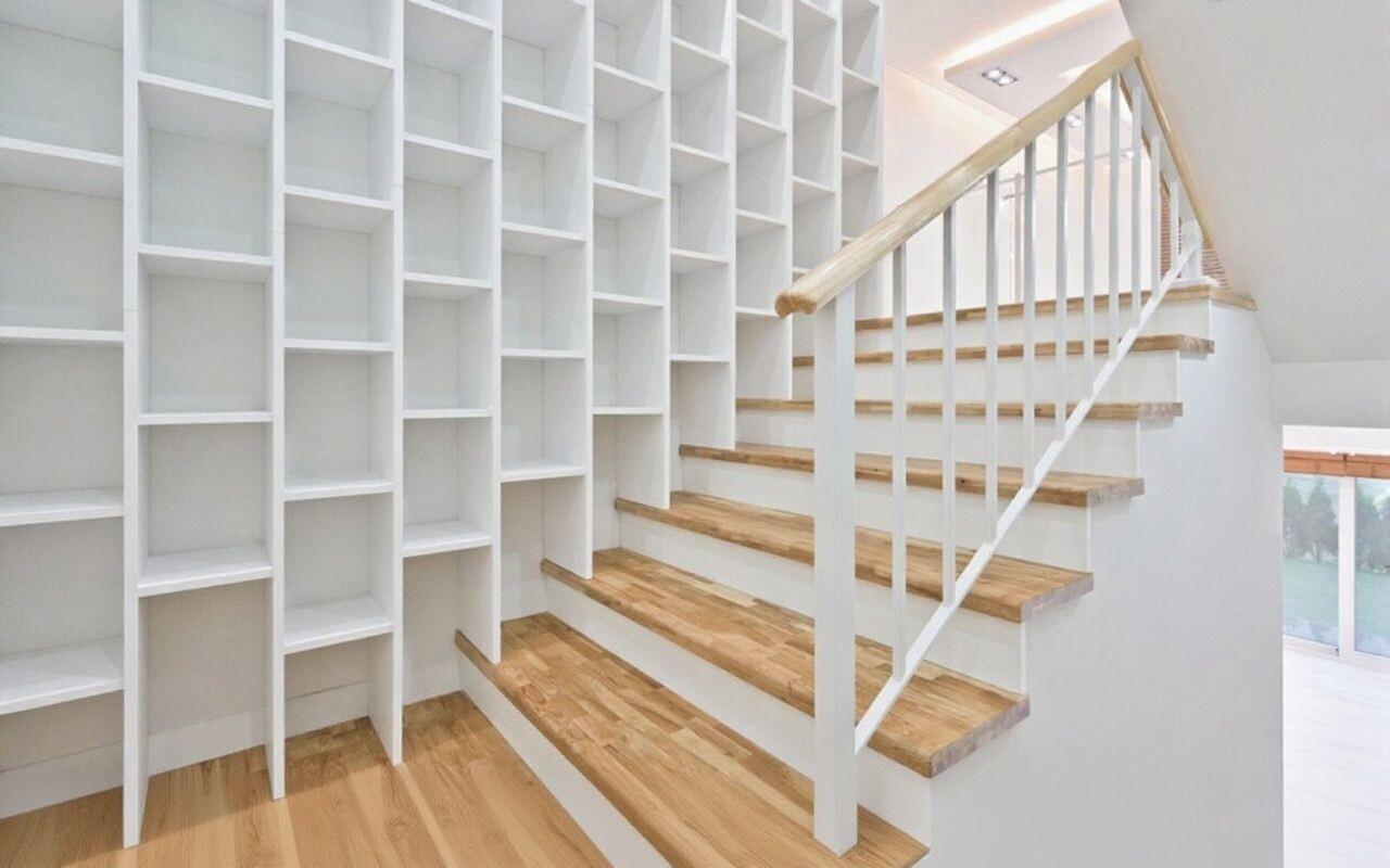 Этот проект — яркий пример того, как лестница может стать умным и функциональным центром всего дома. Вместо стандартной конструкции мы создали сложную архитектурную систему, которая гармонично объединяет в себе зону хранения, элемент зонирования и, собственно, сам подъем на второй этаж. Это смелое и яркое решение для современного пространства, где важен каждый сантиметр.